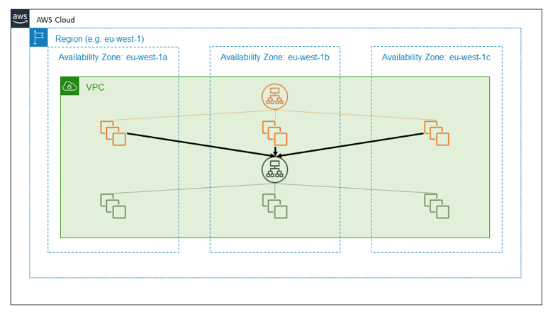 아래 그림과 같이 외부에서 높은 가용성을 이미 확보 했고, 특정 가용 영역에 문제가 생겼다면, 외부 서비스에서부터 요청을 보내지 않을 것이기 때문에 문제가 없다. 그림에서 eu-west-1b 에 문제가 생겼다고 생각해보면, 1b 가용 영역에 존재하는 로드 발란서와 애플리케이션 서버는 전면 장애가 발생한다. 하지만 그 앞에 서 외부 요청을 받는 주황색으로 표시된 시스템의 경우, 1b 가용 영역의 서버를 회피해서 1a, 1c의 서버로 요청이 전달될 것이기 때문에 높은 가용성을 확보할 수 있게 된다.