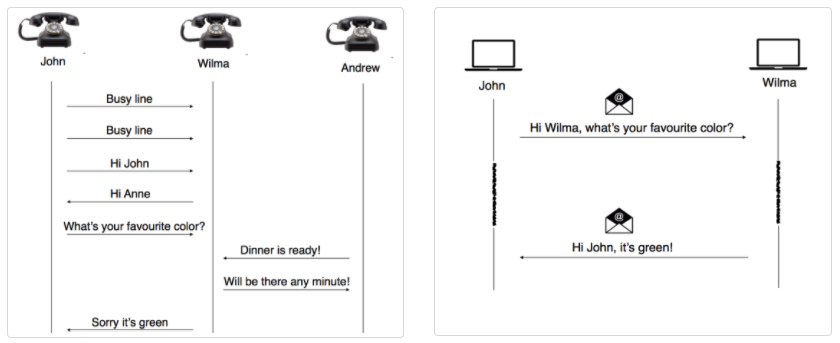 그런 면에서 '전자우편 이야기'를 통하여 좋은 코드 리뷰가 어떤 것인 지 이야기해 볼 필요가 있다. 전자 우편이 동작하는 방식은 비동기 방식이다. 전화의 경우 신호 대기 후 통화가 연결되며 통화를 종료할 때까지 회선을 유지 된다. 이러한 동기식 방식은 직관적으로 즉각적이지만, 참여자를 붙들어 두어야 한다. 반면 전자우편의 경우 상대방에게 전달한 다음 회신이 오기까지 기다려야 하는 비동기 방식이다. 비동기 방식은 즉각적인 반응을 요구하지 않아서 답답할 수 있지만, 느슨한 결합을 통하여 소통하는 대상이 작업이나 상황에 얽매이지 않고 자신의 상황에 맞게 매시지를 해석하고 대응할 수 있는 장점이 있다. 코드 리뷰 중 서로 의견을 교환할 때 이러한 비동기 방식을 지향해야할 필요가 있다는 것을 이야기하기 위해서 전자우편 이야기를 가져왔다.